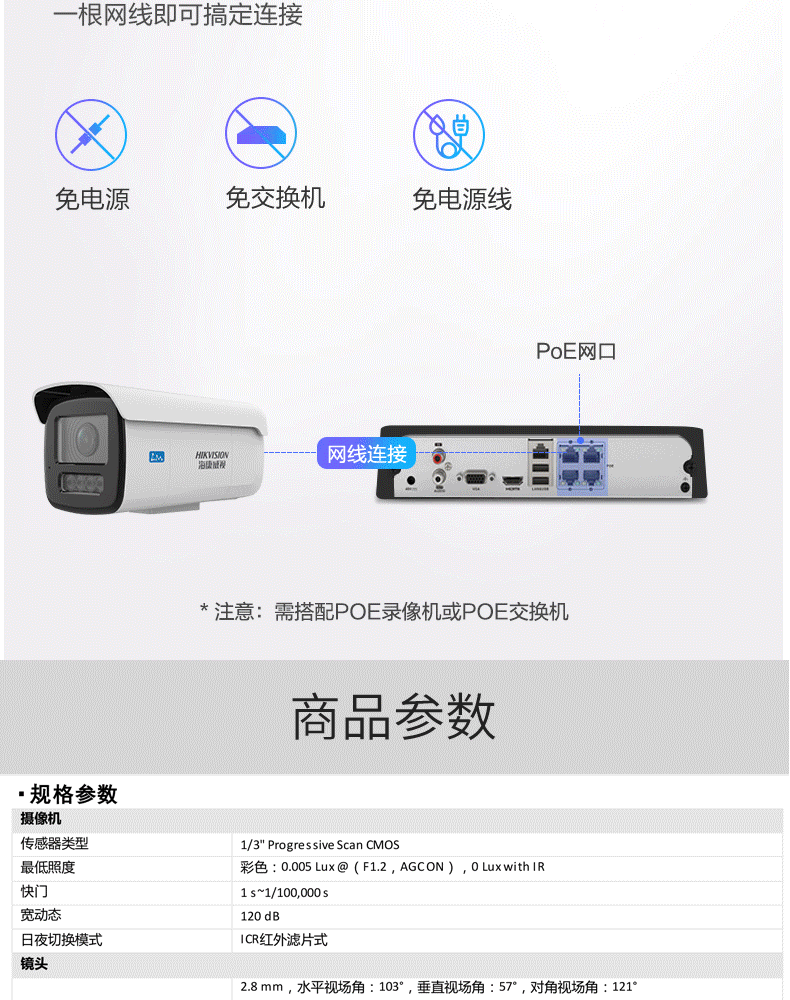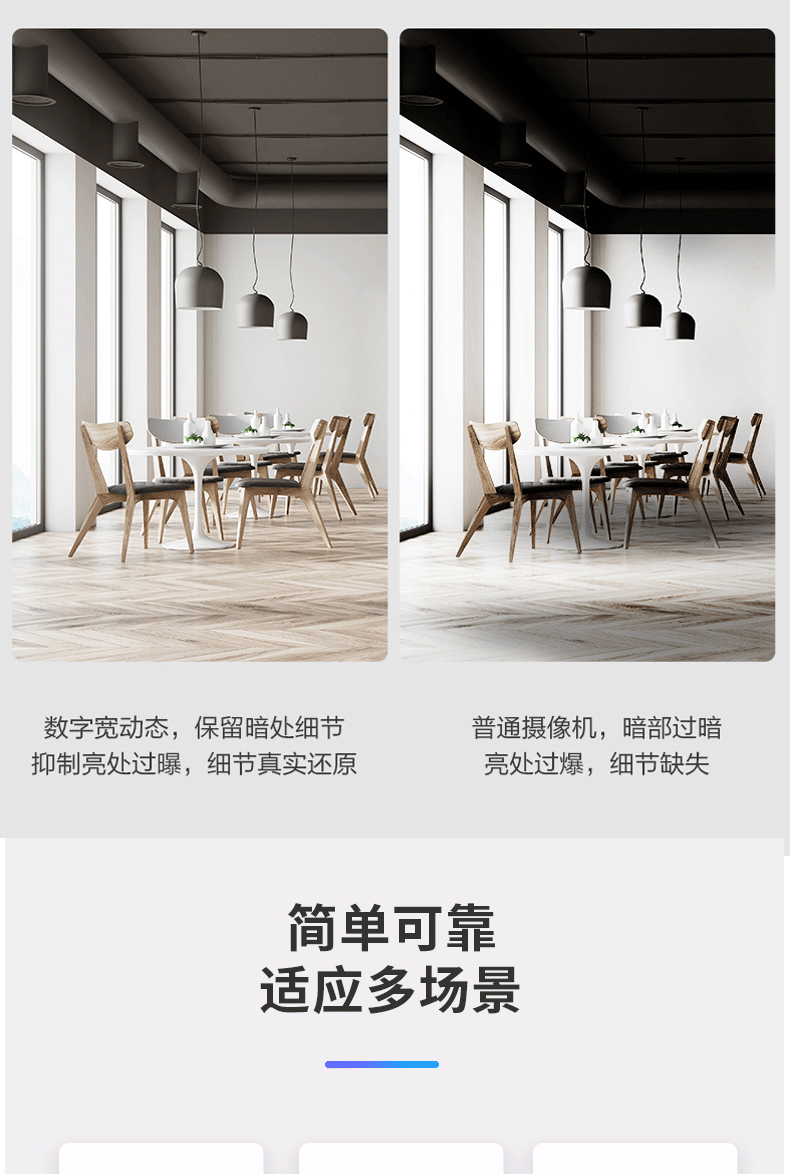 支持背光补偿,强光抑制,3D数字降噪,120 dB宽动态